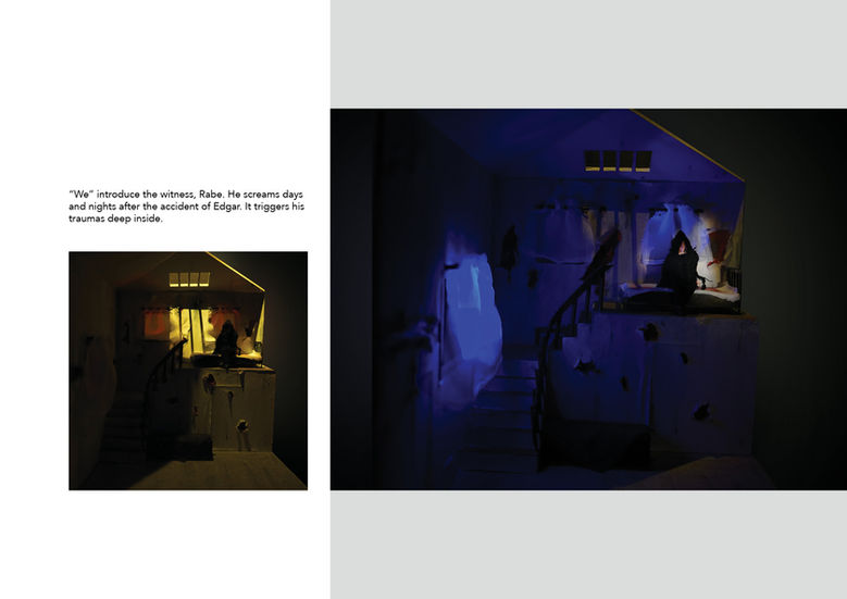 Concept: The design emphasises the community’s alienated and decaying relationships. Though everyone lives close together, they remain emotionally distant, disconnected beneath the surface. The stage takes the form of a rotating house, revealing both interior and exterior views. As the story unfolds, the house changes by its torn wallpaper. The structure decays and exposes the hidden, rotten layers that mirror the community’s inner collapse.